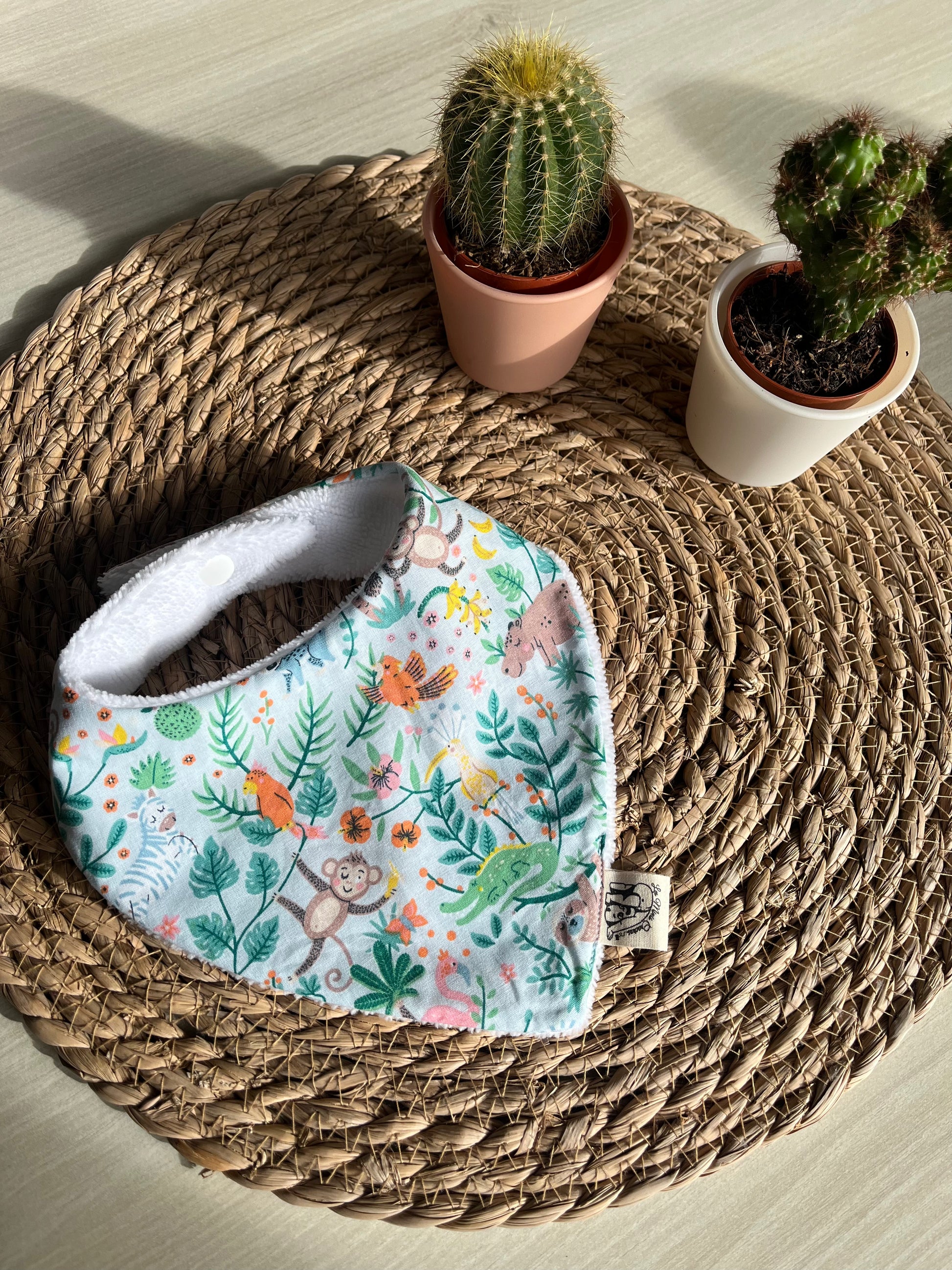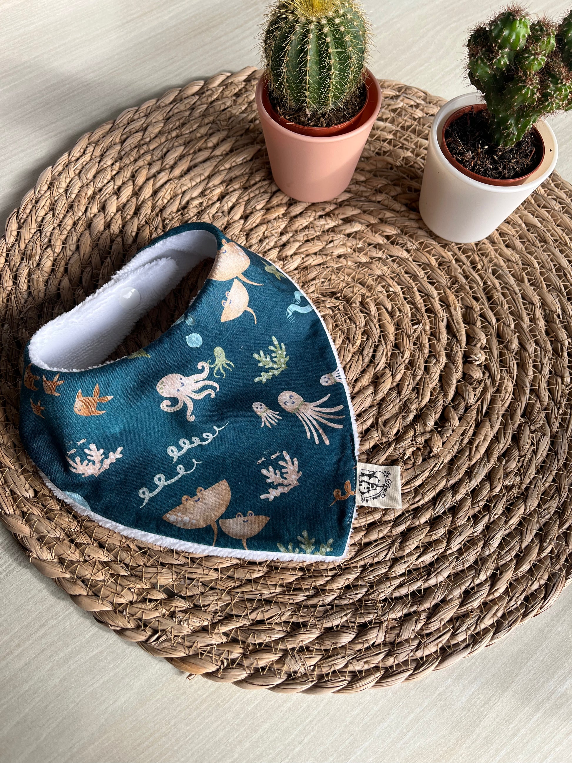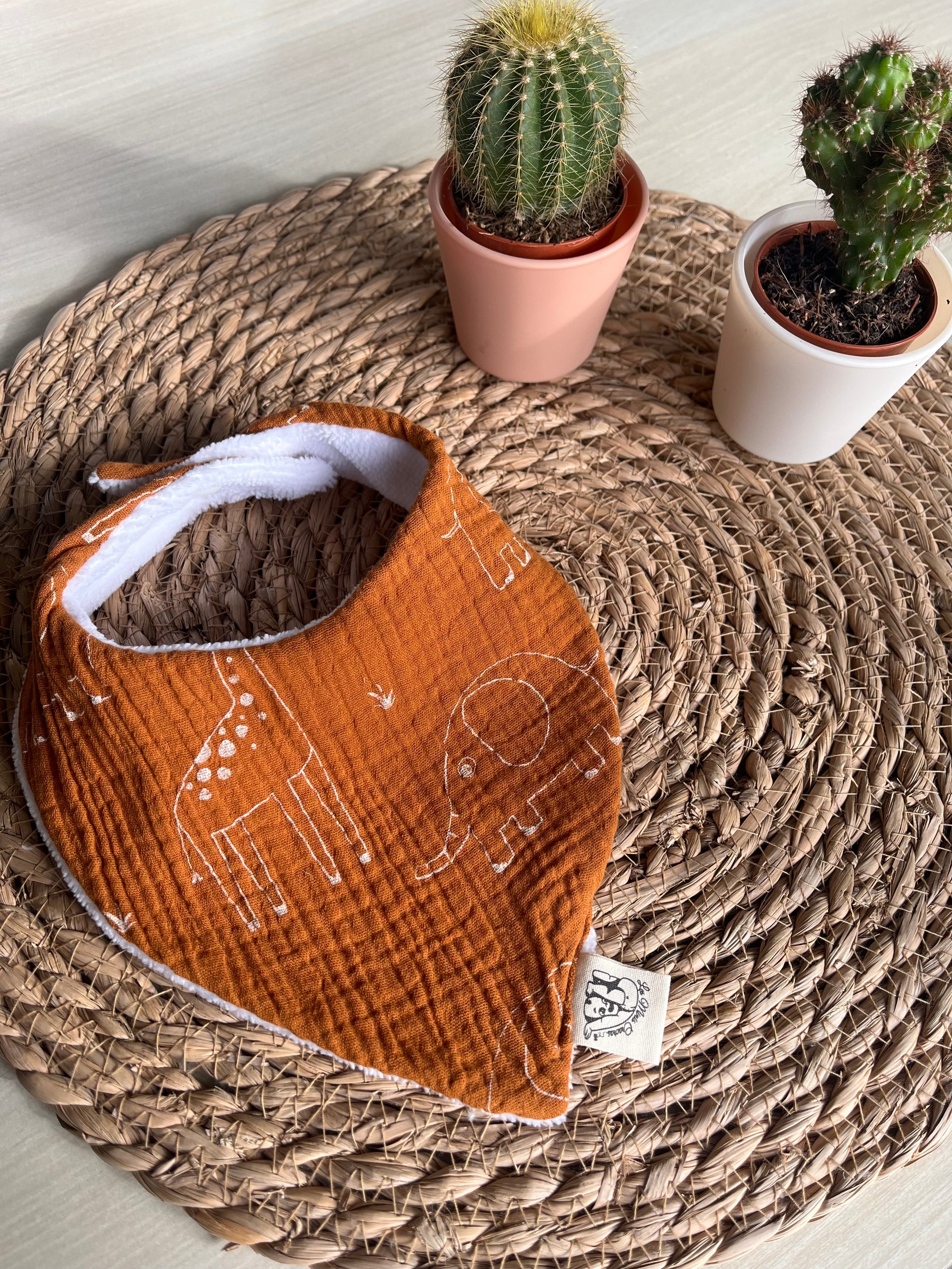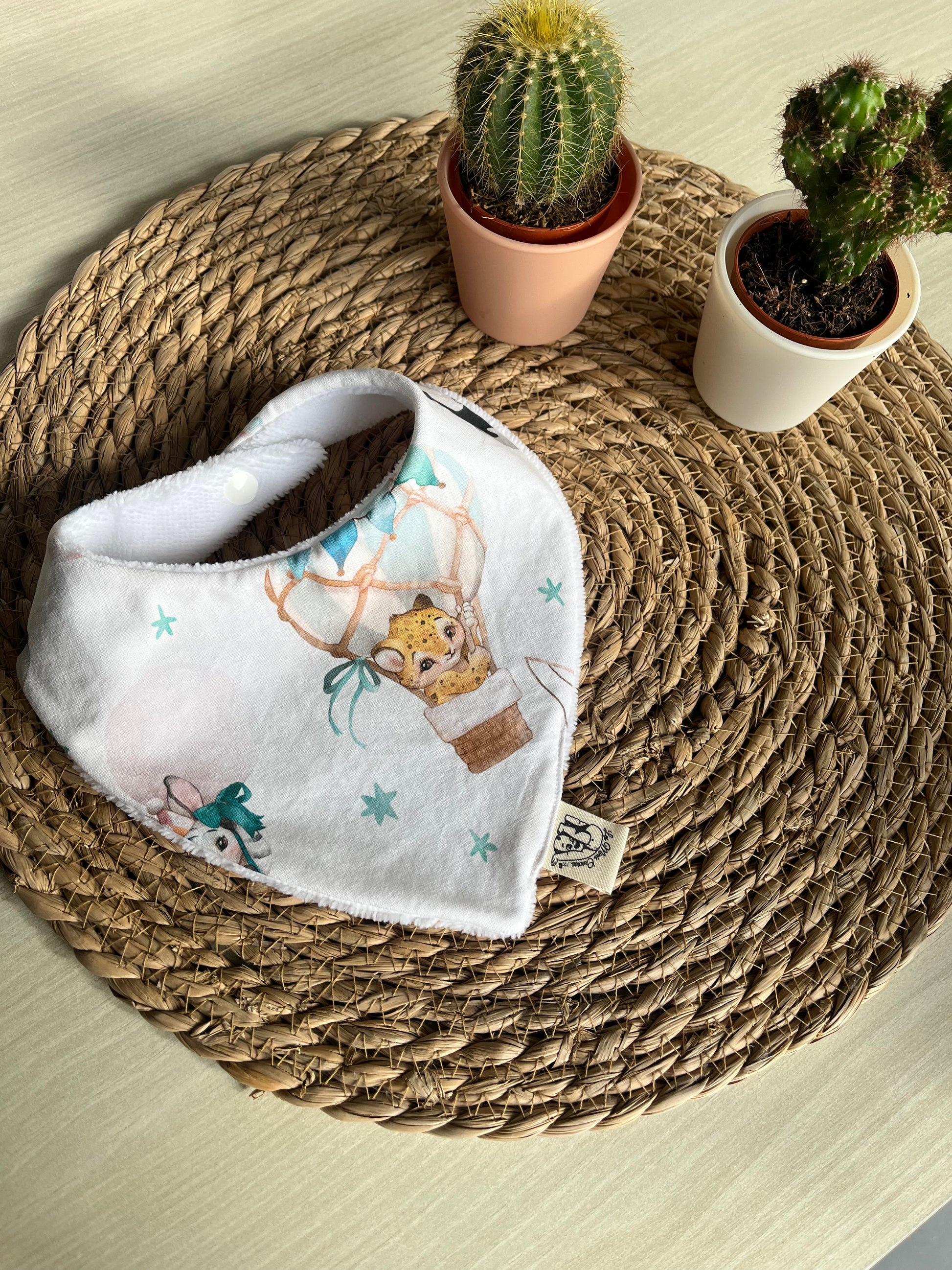 Fabriqué à la main sur l'ile d'Oléron, avec un tissu éponge oeko-tex en fibres de bambou et un tissu à motifs au choix à l'avant en coton, double gaze ou nid d'abeille.
