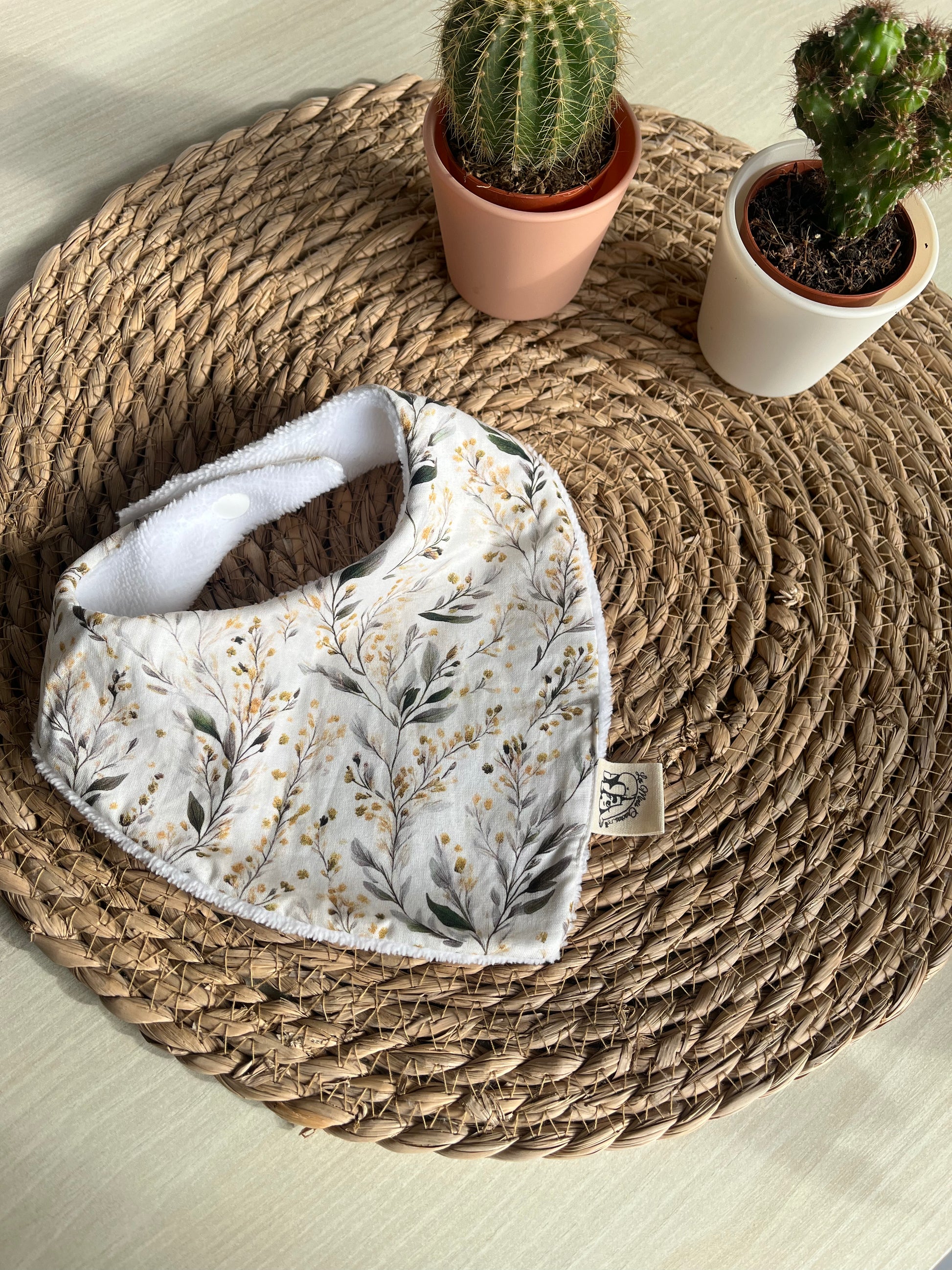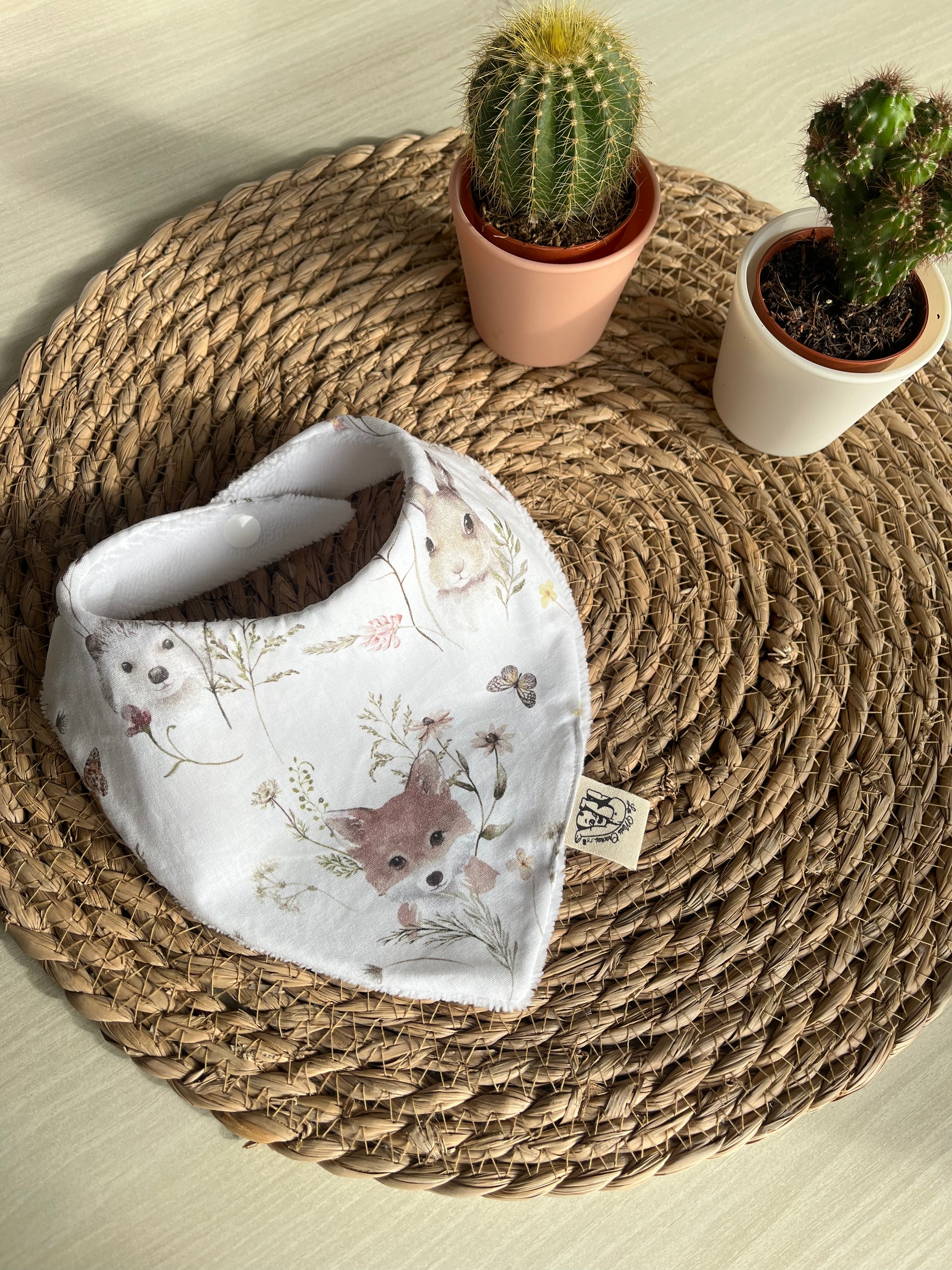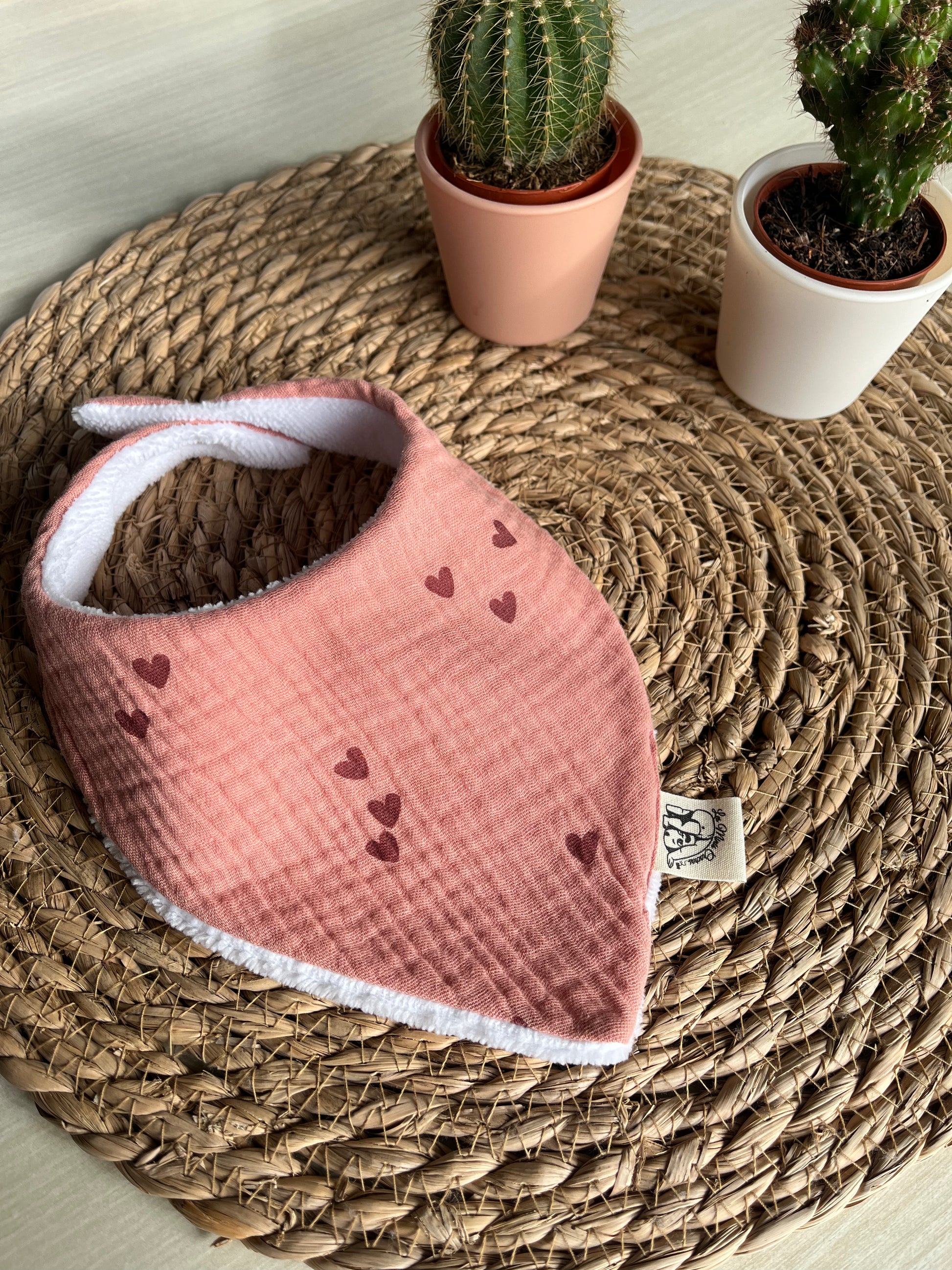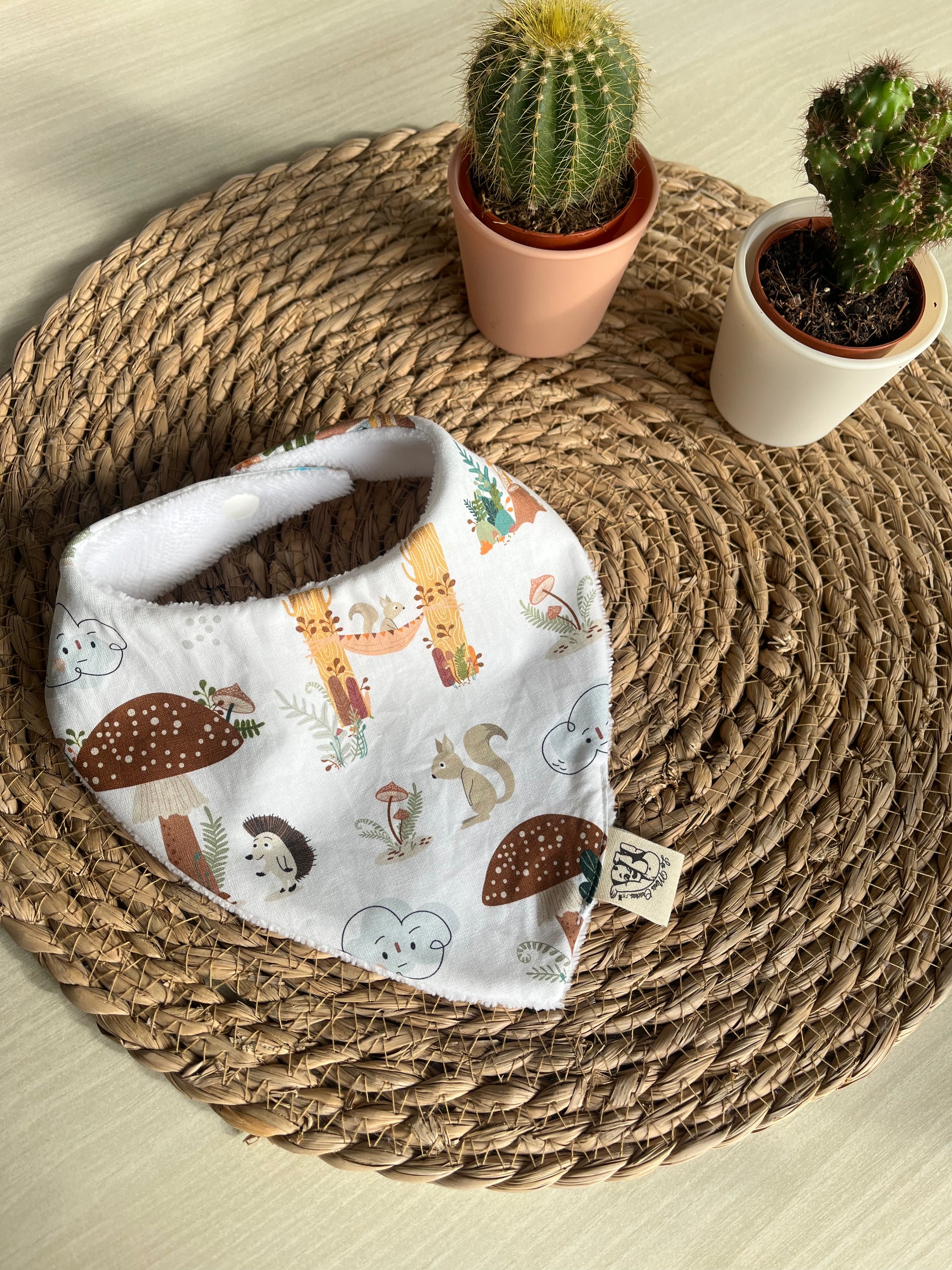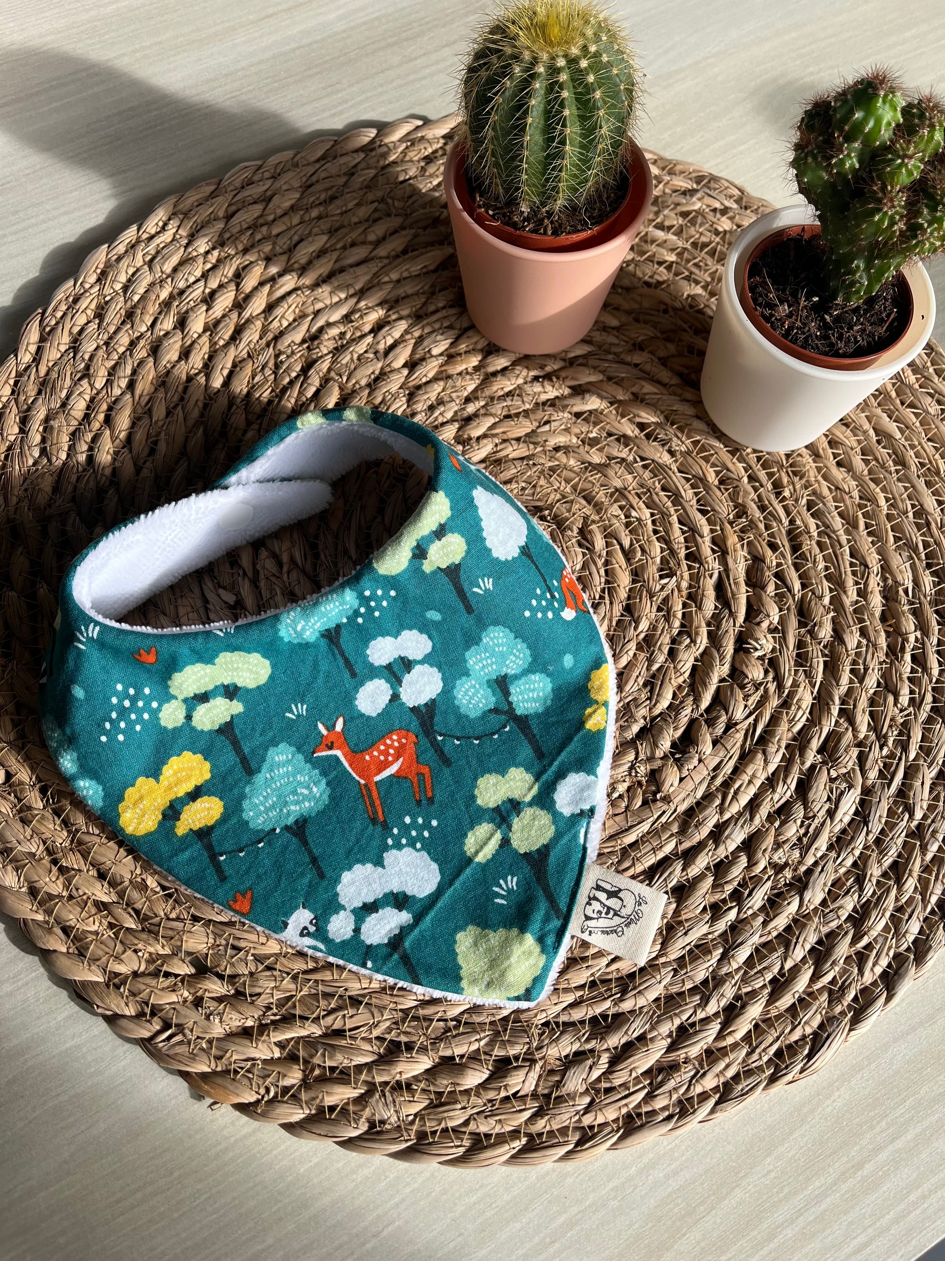 Fabriqué à la main sur l'ile d'Oléron, avec un tissu éponge oeko-tex en fibres de bambou et un tissu à motifs au choix à l'avant en coton, double gaze ou nid d'abeille.