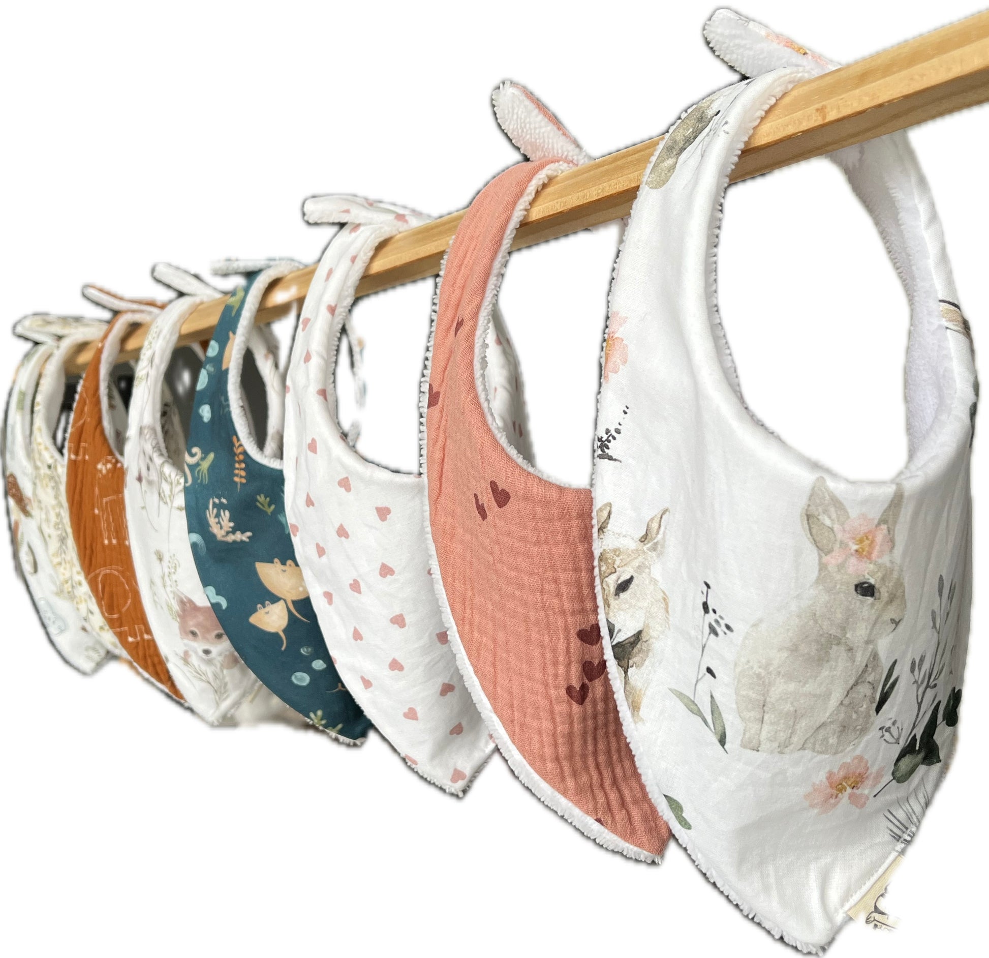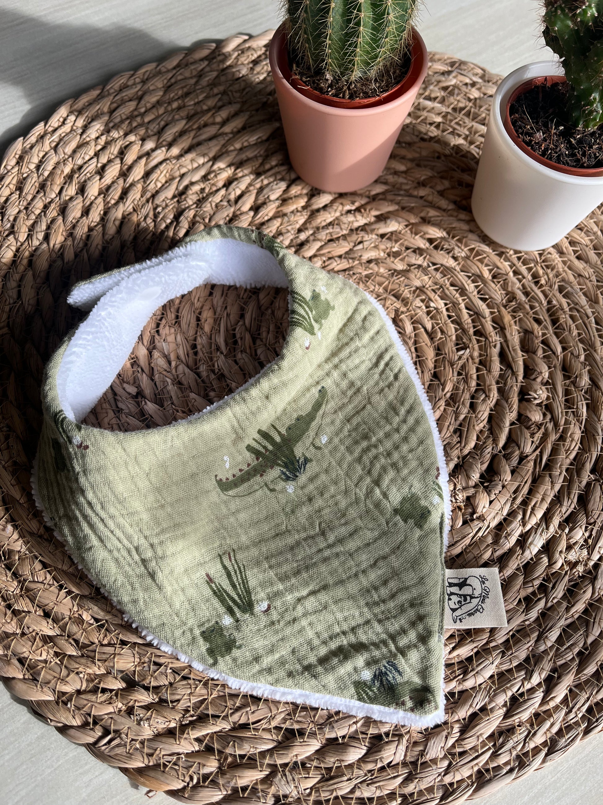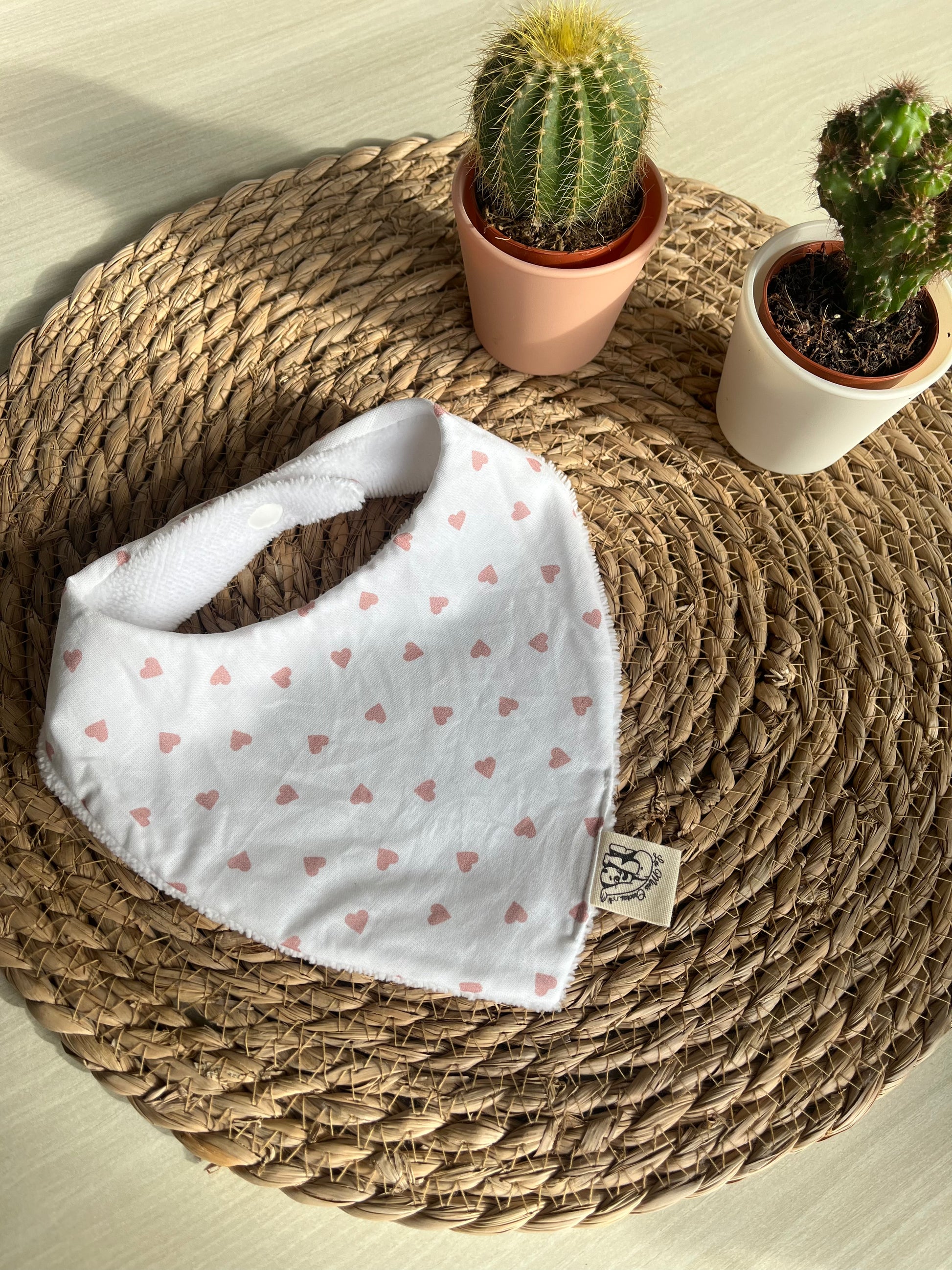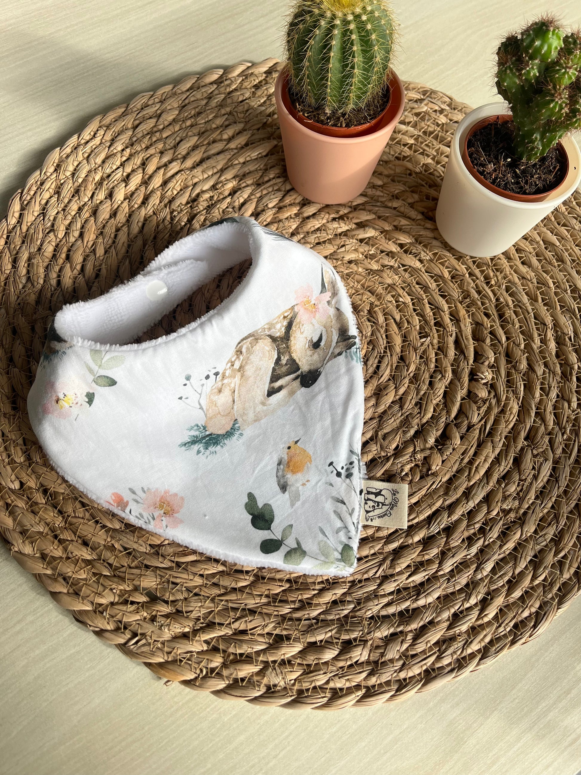 Fabriqué à la main sur l'ile d'Oléron, avec un tissu éponge oeko-tex en fibres de bambou et un tissu à motifs au choix à l'avant en coton, double gaze ou nid d'abeille.