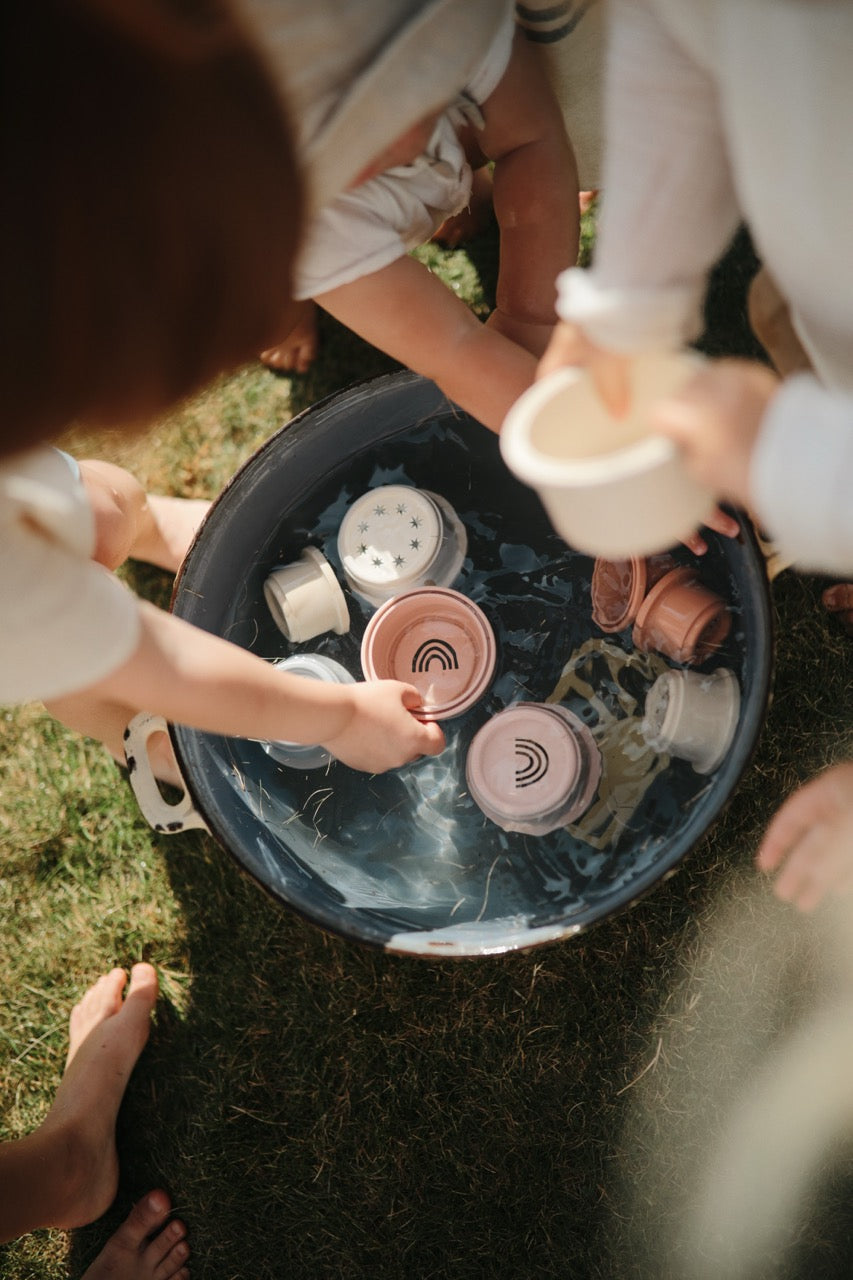 Il va pouvoir l'utilisé autant dans la maison comme un jeu de construction mais aussi dans le bain ou à la plage pour réaliser du transvasement. En effet leur forme creuse permet de pouvoir faire des châteaux ou encore laisser passer l'eau à travers les différents trous de certains gobelets.